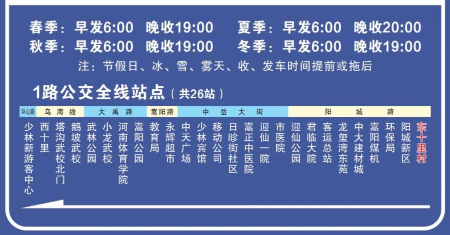 东十里村→阳城新区→环保局→嵩阳煤机→中大建材城→龙玺湾东苑→客运总站→君临大院→迎仙公园→市医院→迎仙一院→嵩正中医院→日昣街社区→移动公司→少林宾馆→中天广场→永辉超市→教育局→嵩阳公园→河南体育学院→小龙武校→武林公园→鹅坡武校→塔沟武校北门→西十里→少林新游客中心