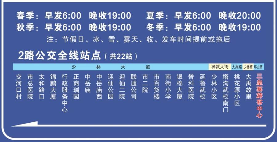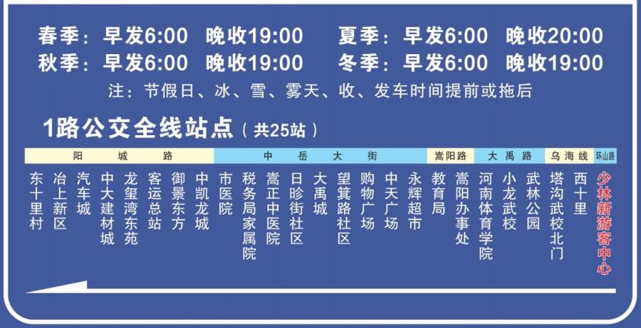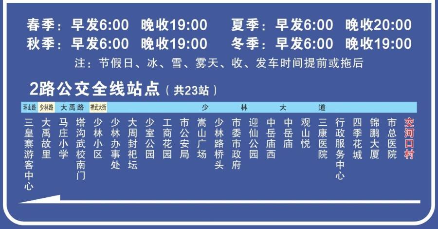 交河口村→市总医院→锦鹏大厦→四季花城→行政服务中心→三康医院→观山悦→中岳庙→中岳庙西→迎仙公园→市委市政府→少林路桥头→嵩山广场→市公安局→工商花园→少室公园→大周封祀坛→少林办事处→少林小区→塔沟武校南门→马庄小学→大禹故里→三皇寨游客中心