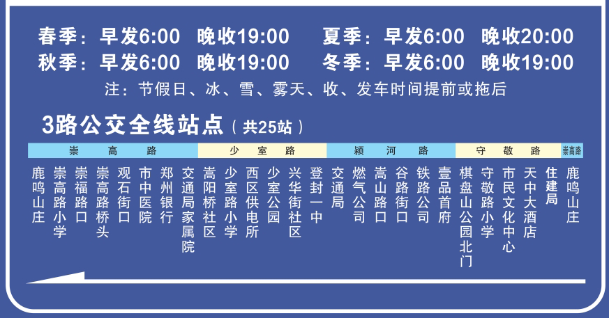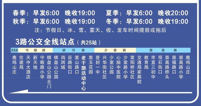 鹿鸣山庄→崇高路小学→崇福路口→崇高路桥头→观石街口→市直三初中→教育局→交通局家属院→嵩阳桥社区→少室路小学→心脑中医院→少室公园→兴华街社区→登封一中→嵩玉花园→老干部活动中心→嵩山路口→谷路街口→鸿润城→棋盘山公园→棋盘山公园北门→守敬路小学→新天地→天中大酒店→住建局→鹿鸣山庄