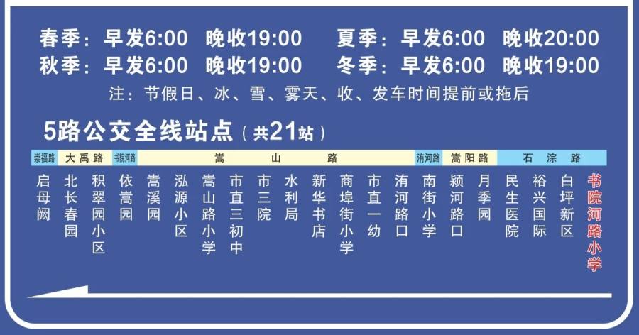 书院河路小学→白坪新区→裕兴国际→民生医院→月季园→颍河路口→南街小学→洧河路口→市直一幼→商埠街小学→新华书店→水利局→市三院→市直三初中→嵩山路小学→泓源小区→嵩溪园→依嵩园→积翠园小区→北长春园→启母阙