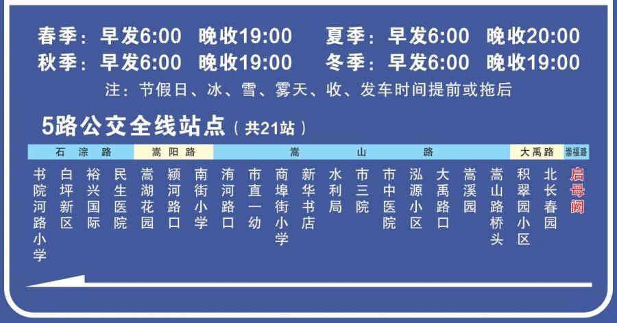 启母阙→北长春园→积翠园小区→嵩山路桥头→嵩溪园→大禹路口→泓源小区→市中医院→市三院→水利局→新华书店→商埠街小学→市直一幼→洧河路口→南街小学→颍河路口→嵩湖花园→民生医院→裕兴国际→白坪新区→书院河路小学