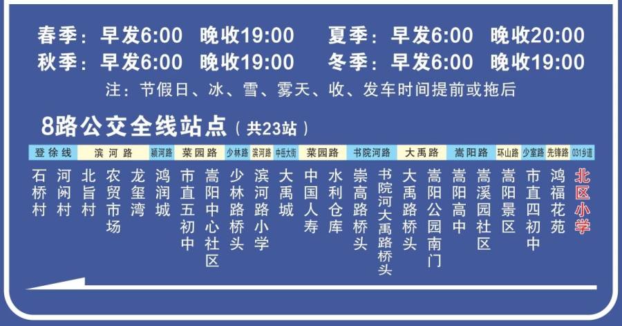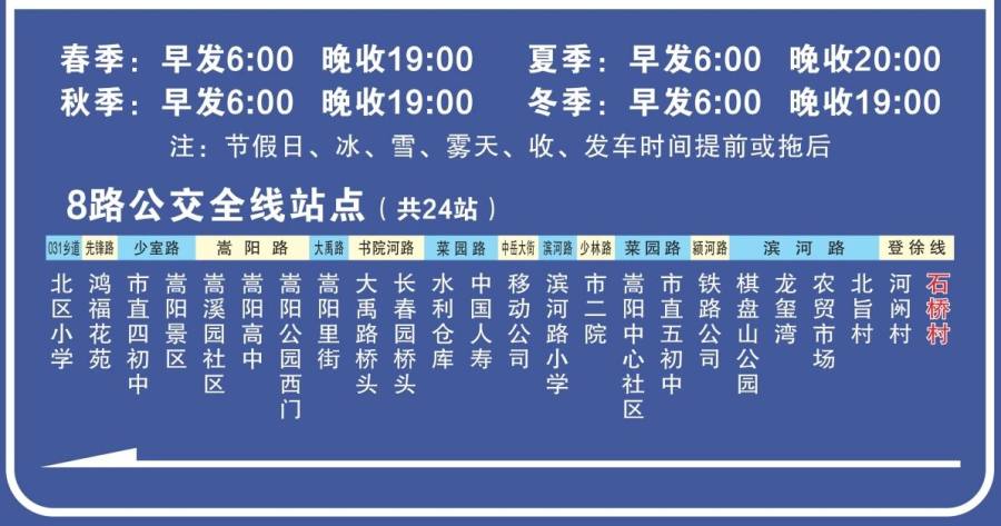 石桥村→河门村→北旨村→农贸市场→龙玺湾→棋盘山公园→铁路公司→市直五初中→嵩阳中心社区→市二院→滨河路小学→移动公司→中国人寿→水利仓库→长春园桥头→大禹路桥头→嵩阳里街→嵩阳公园西门→嵩阳高中→嵩溪园社区→嵩阳景区→市直四初中→鸿福花园→北区小学