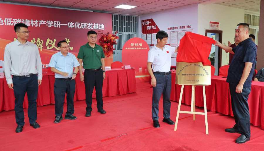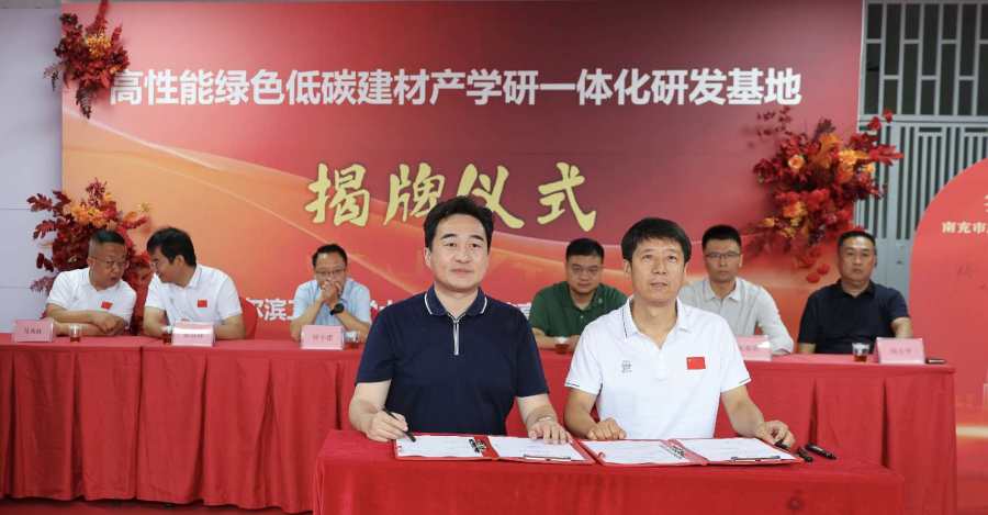 哈尔滨工业大学教授高小建与南充市顺嘉高建材有限公司董事长何小平共同为高性能绿色低碳建材研发基地揭牌。