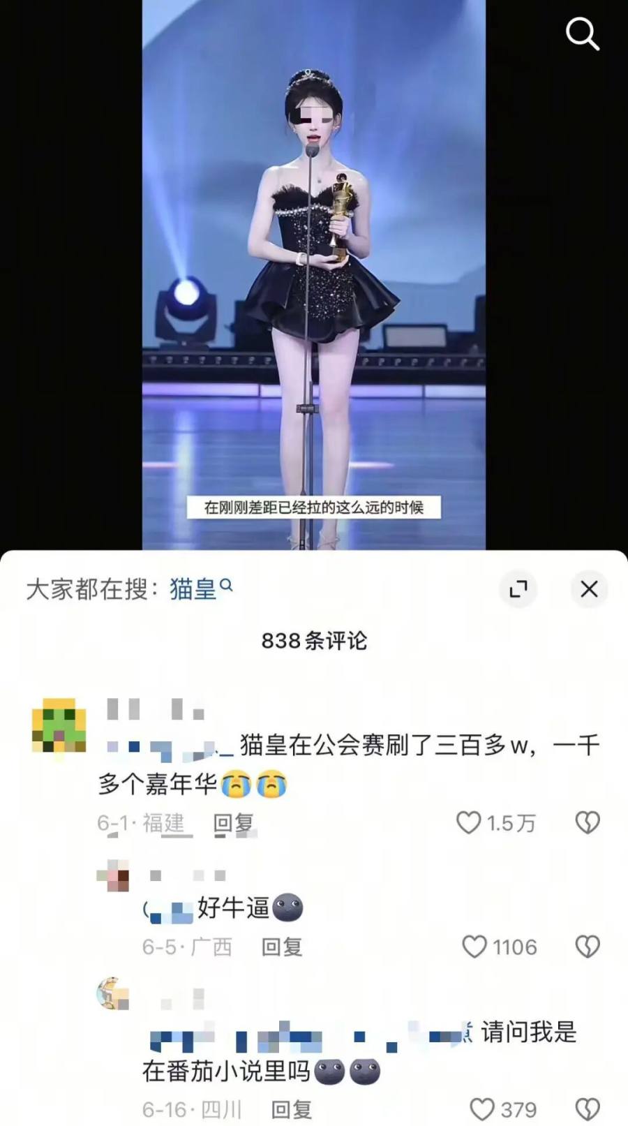 哪怕8月3日那天,猫皇还在卡卡的直播里帮她维稳粉圈,但到了月底的公会赛,那个被粉丝期待了一晚上的ID,却从头到尾没有出现。“这次公会赛的第一,完全是靠散票拿下的;要是猫皇在,绝不会打得这么吃力,而且还得感谢另一位主播懒懒及其神豪‘x皇’没有参与竞争。”