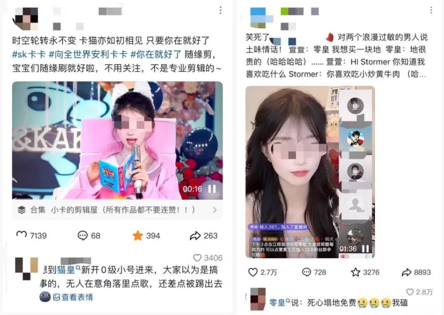 所谓“卡猫”,是SK公会的头部团播主播卡卡,和她的氪金大佬“猫皇”(网名:小猫猫)的CP。据粉丝说,这位氪金大佬在一年内,给主播卡卡豪掷3000万元,成了SK公会的总榜一大哥。
