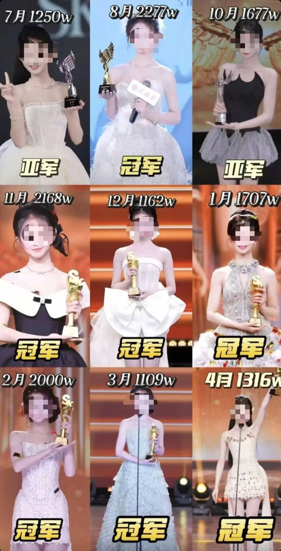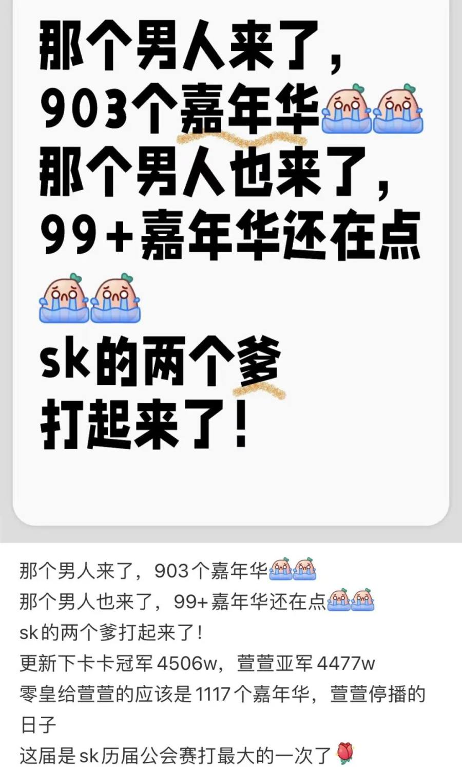 今年5月公会赛,卡卡和萱萱争夺第一名:零皇先为萱萱刷了1117个单价3000元的嘉年华,暂时领先;随后猫皇为卡卡刷了947个等级更高、单价3500元的嘉年华,逆转票局,最终帮卡卡拿下第一。