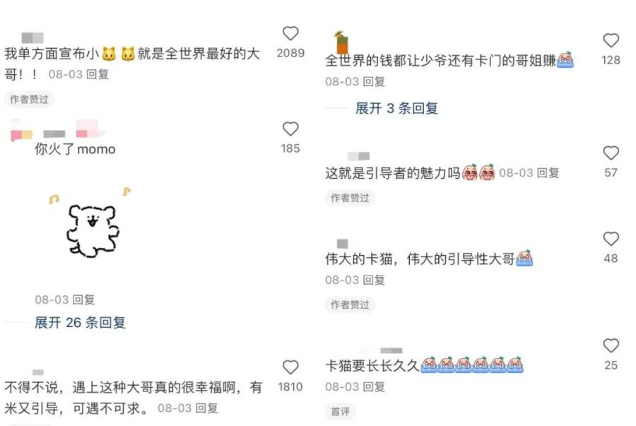 卡卡在直播中感谢榜一的录屏下,评论区的高赞留言会说“单方面宣布小猫就是全世界最好的大哥!!”“这就是引导者的魅力吗?”