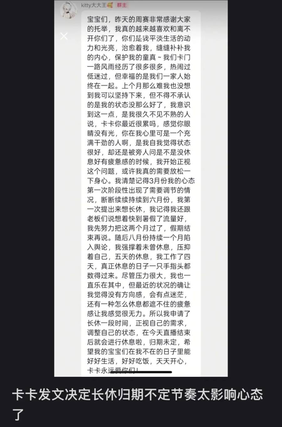 而在8月底过去仅仅不到半个月时间,卡卡也宣布了自己要“休息”“调整心态”的消息。对于这部分双双脱粉的团播cp粉来说,这甚至是个“好消息”。