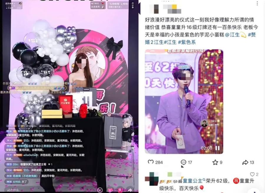 大哥与主播之间还有好几个纪念日:主播开播一周年、粉丝灯牌(粉丝在直播间支持主播的虚拟标识,本质是粉丝团身份的象征)一周年。灯牌每升一级,主播都会在直播里为榜一设计专属庆祝环节,比如写感谢信、送礼物、吃蛋糕等;榜一也会回赠“金钱与仪式感并重”的礼物,比如刷出“宇宙之心”(特效礼物),或是安排无人机应援。