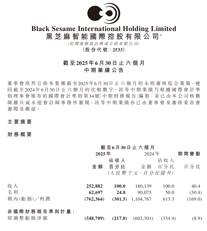 上半年亏损超7亿元、毛利率腰斩,黑芝麻智能徘徊在掉队边缘?
