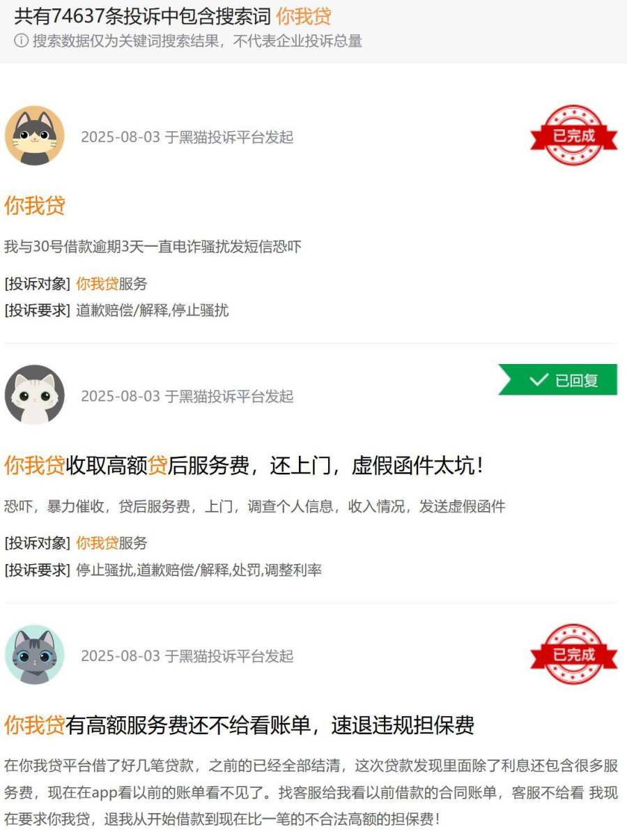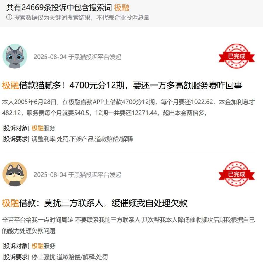 嘉银科技面临的合规问题犹如一座大山,压得其喘不过气来。在黑猫投诉平台上,以“你我贷”和“极融”为关键词的搜索结果高达近10万条,投诉内容聚焦于高利率、暴力催收和隐性收费三大问题。用户纷纷反映,借款合同中服务费、担保费等隐藏条款繁多,普通借款人难以看清真实成本。这种信息不透明和收费复杂化的做法,不仅侵犯了消费者的知情权,更可能触碰监管红线,放大合规风险。