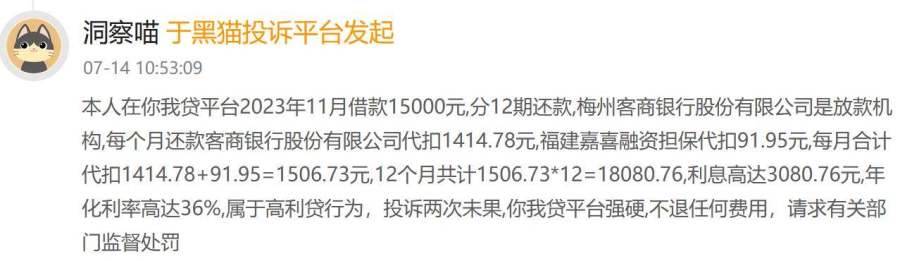尤为突出的是高利率问题。嘉银科技宣称的年化利率从7%起,但叠加担保费、服务费后,部分用户的综合年化利率竟高达36%,远超法律规定的24%上限。这种高息贷款模式无疑是对法律底线的公然挑衅,也引发了广泛的质疑和批评。一位用户通过“你我贷”贷款15000元,分12期每期含91.95元附加费,综合年化利率达36%。