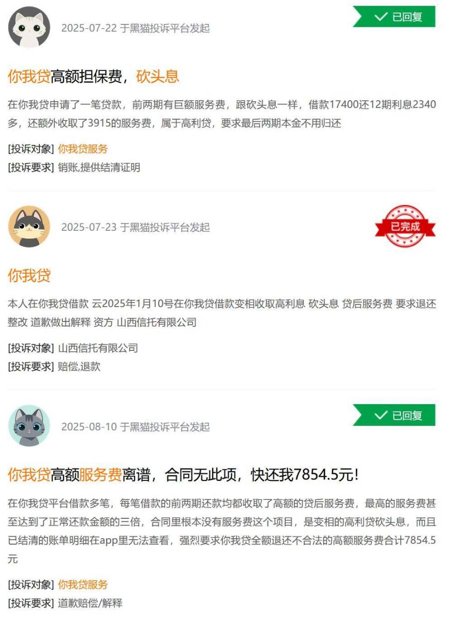 另有用户称,“你我贷”前两期收取高额“贷后服务费”,最高达正常还款额三倍,合同未明确标注,涉嫌变相“砍头息”。