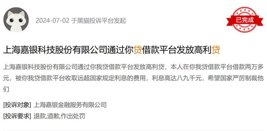 此外,还有用户反映,借款存在“砍头息”,实际到手金额低于合同标示金额,变相推高融资成本。黑猫投诉显示,7月2日有用户称:“上海嘉银科技股份有限公司通过‘你我贷’借款平台发放高利贷,本人在‘你我贷’借款平台借款2.5万元,被‘你我贷’借款平台收取远超国家规定利息的费用,利息高达八九千元。”这些行为不仅损害了消费者的利益,更让嘉银科技陷入了合规的泥潭之中。