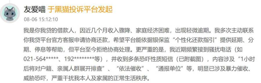 嘉银科技的催收策略也引发了广泛的争议。为了追求低逾期率,公司采取了激进的催收手段。客服明确要求用户“需逾期后再协商”,但逾期后,催收手段却被用户投诉为侵扰性极强。黑猫投诉平台上,用户纷纷反映遭遇了暴力催收、电话骚扰亲友等恶劣行为。这些行为不仅严重干扰了用户的正常生活,更与平台“文明催收”的承诺形成了鲜明的反差。