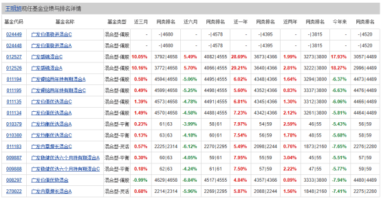 而让广发基金创下如此“丢脸”成绩的根源,则多数来源于百亿基金经理、总经理助理、投资管理部总经理王明旭。履历上,王明旭并非行业新人,6.9年的投资经理年限,先后在东北证券、生命人寿、恒泰证券、东方证券和兴业基金任职,令其积累了丰富的行业经验。但从现实业绩来看,业绩却并不与之匹配。
