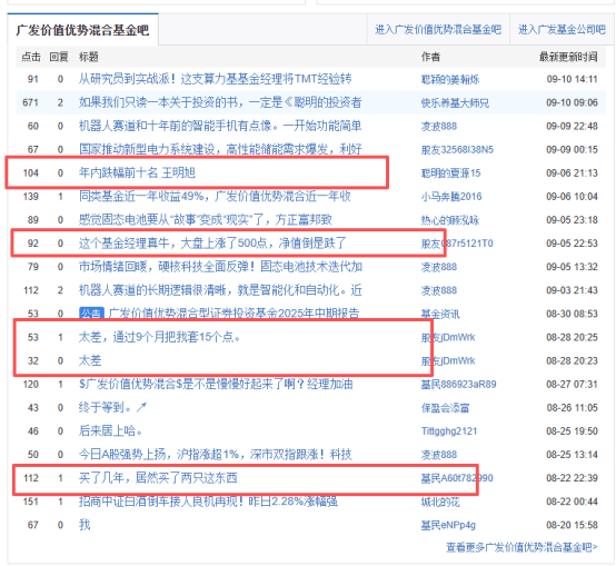 截至目前,王明旭在管8只产品中有6只年内亏损,近乎占据了广发基金亏损主动权益基的全部。其中收益最低的为广发价值优势(年内收益-7.56%),任职回报中也有着半数为负。对此,相关投资者也是怨声载道,有投资者在股吧表示,太差,通过9个月把我套15个点。还有投资者表示:“这个基金经理真牛,大盘上涨了500点,净值倒是跌了15%”。如此的业绩,在基金经理业绩普遍回正背景下,也不知道是如何吸引到如此规模产品,又如何能够服众、稳坐领导岗位的。