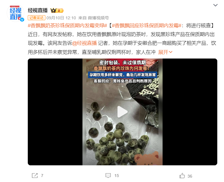 据“中国质量报告”报道,近日,有网友发帖称,她在饮用香飘飘原叶现泡奶茶时,发现黑珍珠产品在保质期内出现发霉。该网友表示,她在孕期于安徽合肥一商超购买了相关产品,饮用多杯后并未察觉异常,直至哺乳期仅剩两杯时,家人在冲泡过程中发现其中一袋珍珠存在明显绿色霉菌。