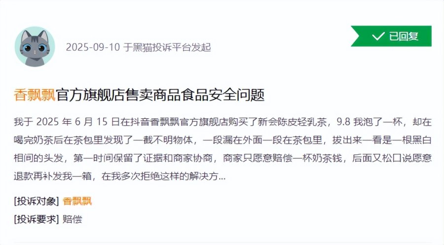 不过,黑猫投诉平台上,仍有多位消费者因食品安全问题投诉了香飘飘。9月10日,一消费者称,其6月15日购买的新会陈皮轻乳茶茶包中有一截黑白相间的头发;8月7日,一消费者表示,其8月4日购买的芒果芭乐味的香飘飘茶饮出现异物。