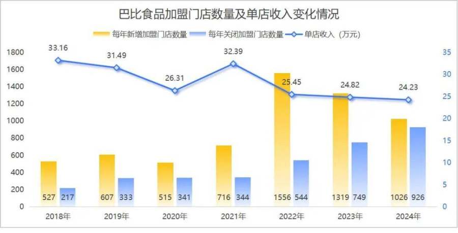 2018年至2024年期间,巴比食品加盟门店的单店收入从33.16万元一路下滑至24.23万元,降幅26.93%。
