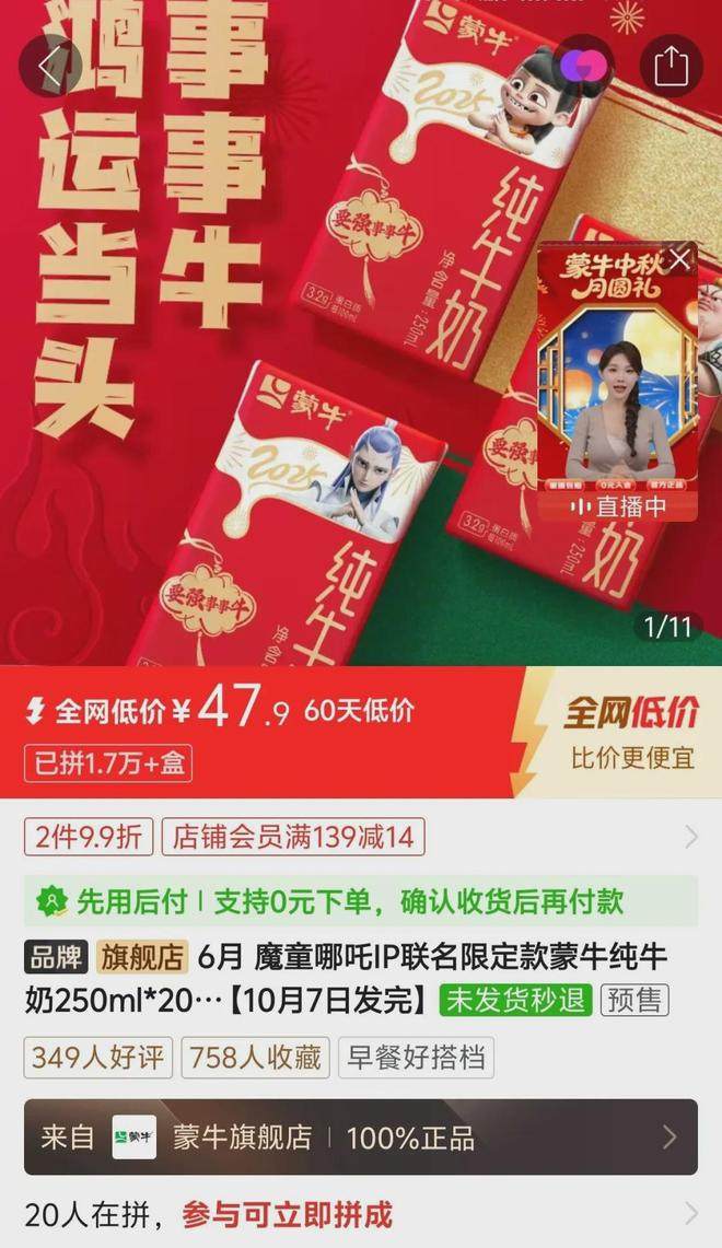 去年10月,借《哪吒1》热度,蒙牛计划与拼多多合作,在《哪吒2》上映前推出“哪吒”联名款牛奶。作为首次尝试IP联名,蒙牛团队既担心滞销,又对联名产品选择存疑,最初计划绑定高端产品。