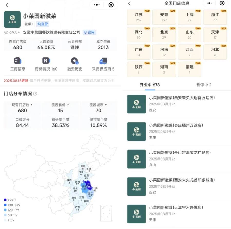 “窄门餐眼”8月15日更新的数据显示,小菜园现有门店数680家,覆盖15个省份,主要集中在江苏和安徽;这意味着距离年底的不到五个月时间,至少要新开120家门店。