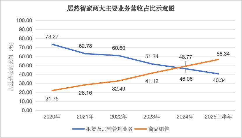 去年,居然智家的商品销售业务首次以48.77%的占比,超越租赁及加盟管理业务46.06%的占比,成为公司的第一大营收来源。今年上半年,公司商品销售业务的营收占比延续了这一态势。