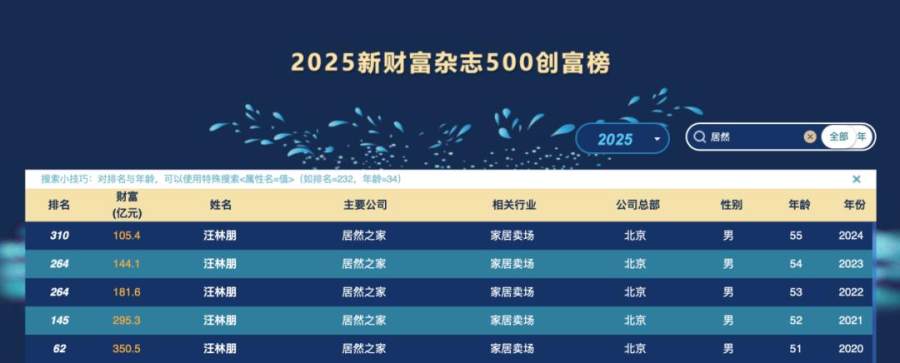 而受行业下行、公司业绩波动等多重因素影响,身为居然智家原掌舵者的汪林朋,其去年在《新财富杂志500创富榜》的财富较巅峰时期缩水约245亿元,今年更是直接跌出该榜单,财富缩水态势进一步恶化。