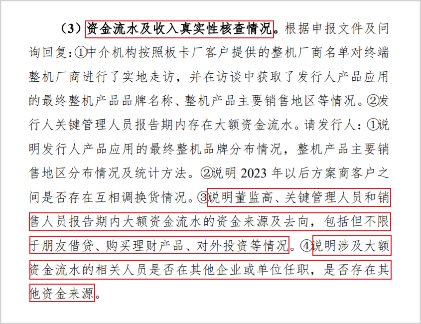 就比如在第三轮问询中,交易所仍然提出了资金流水及收入真实性核查等相关内控疑问,要求发行人说明董监高、关键管理和销售人员大额资金流水的资金来源及去向。