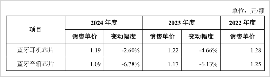 比如在产品单价上,近年来杰理科技包括蓝牙耳机、智能音箱、智能穿戴等产品均出现了不同程度的下滑。以蓝牙耳机和蓝牙音箱芯片为例,2022年销售单价尚在1.28元/颗、1.25元/颗,到2024年便降至1.19元/颗和1.09元/颗。