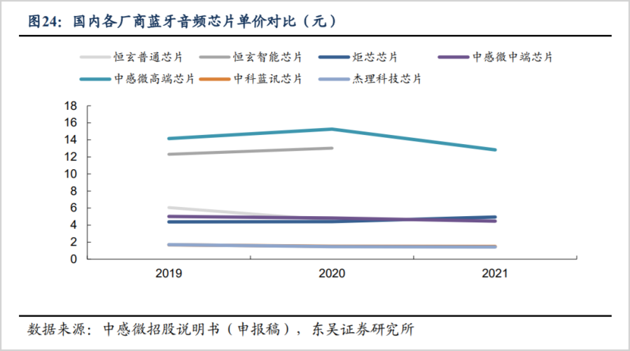 以蓝牙耳机芯片为例,据东吴证券研究,目前杰理科技和中科蓝讯产品主要布局在中低端,产品单价尚不足2元,而包括恒玄科技、炬芯科技和中感微主要布局中高端赛道,其中中感微和恒玄科技的高端智能芯片已经在10元以上。