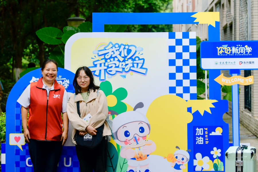 为了给新生留下踏入大学校园的第一份美好记忆,物业服务中心巧妙利用园区景观,精心布置了多处温馨有趣的“迎新打卡点”。从写有“你好,新同学!”“重医,我来了!”的创意背景板,到融合了医学元素和校园风光的特色相框,吸引了众多新生驻足拍照留念。镜头定格下灿烂的笑容,也开启了他们在重庆医科大学袁家岗校区的崭新篇章。