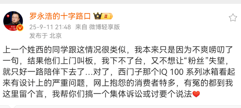 可是,老罗你能“打赢那场仗”难道不是因为冰箱门关不上吗?然后调查统计发现大量类似问题,才有实锤赢。