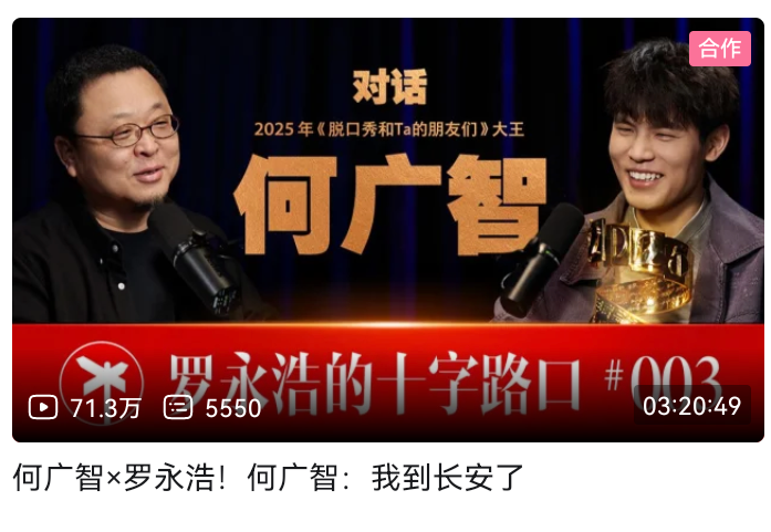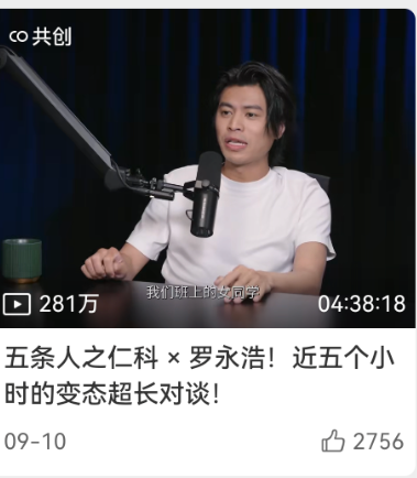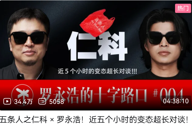 老罗最新一期的播客节目,是与仁科的访谈,在B站播放量34.4万;上一期与何广智的播客节目B站播放量71万。