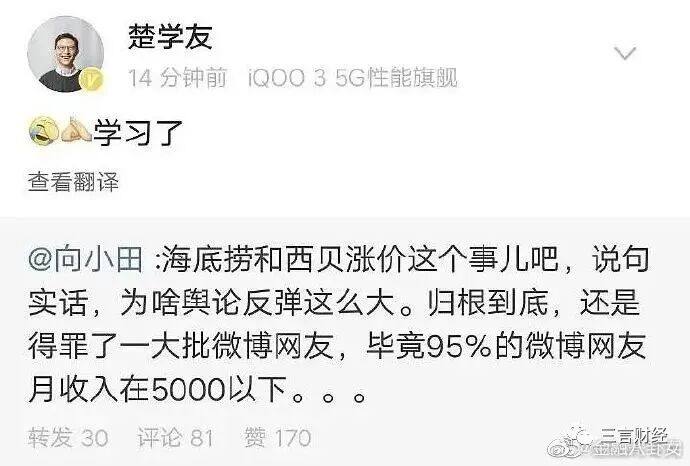 犹记得2020年,西贝前副总裁转发博主“餐品涨价被喷那是95%网友收入5000以下”评论,还来一句“学习了”。
