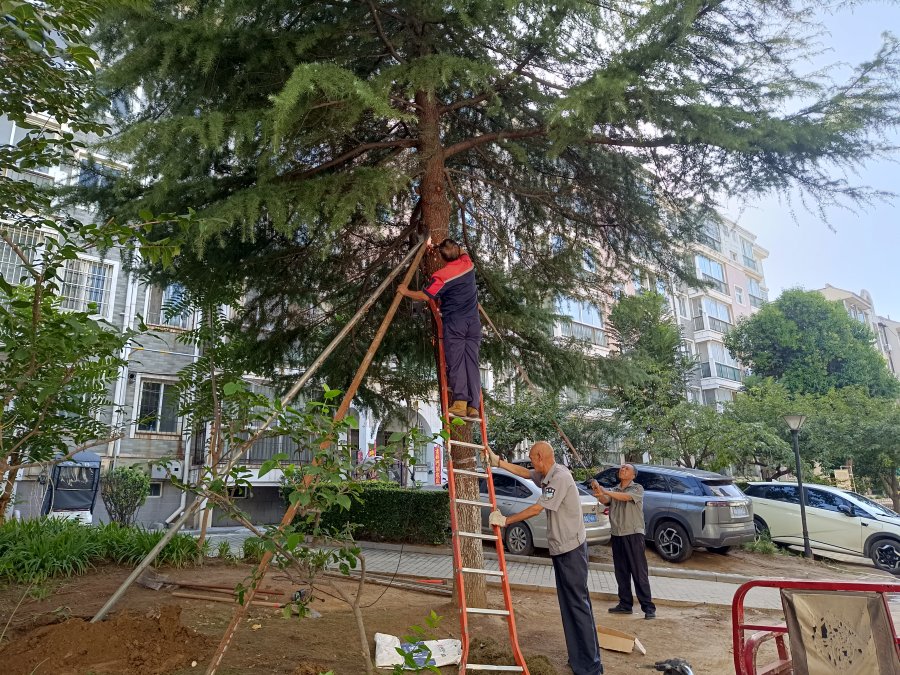社区微网格长在日常走访中留意到,小区里几株松树因生长年份久、受风雨侵蚀等因素,出现不同程度倾斜,部分松枝也因过度生长,不仅影响树木自身长势,还存在断裂掉落、遮挡居民视野与公共设施的隐患。为解决这一问题,社区迅速联动物业,组织专业人员先清理树木周边杂物,用钢管支架稳固树干防止倾倒;再细致修剪枯萎、过密枝条,既保障树木健康生长,又避免枝叶遮挡交通标识、触碰电线。