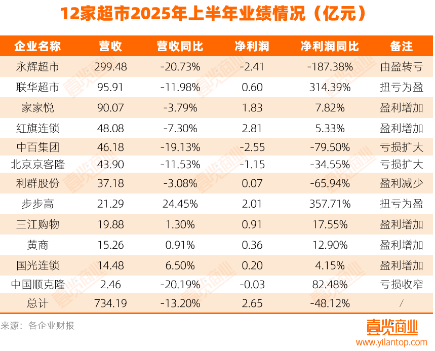 据壹览商业统计,2025年上半年,12家上市商超企业总营收为734.19亿元,同比下滑13.20%;总净利润达2.65亿元,同比下滑48.12%,近乎腰斩。