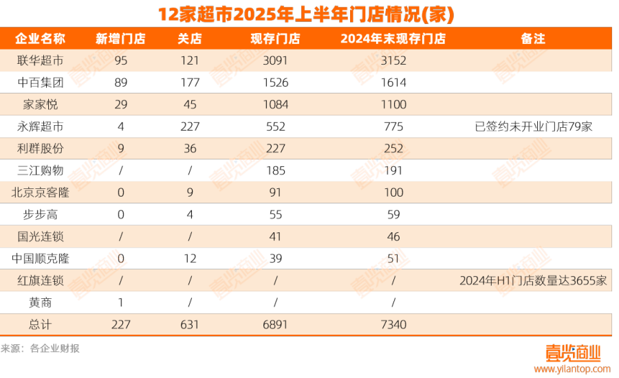 具体而言,永辉超市闭店数量最多,上半年关闭门店227家;中百集团与联华超市闭店数量分别为177家和121家。其中,中百集团关闭了13家大卖场和109家社区超市。