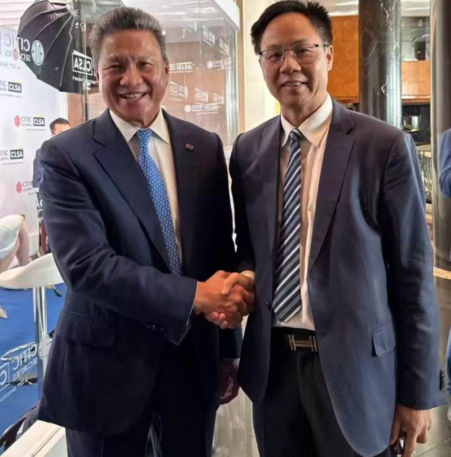 红牌集团董事长叶志聪(左)与中央港澳办副主任周霁亲切握手