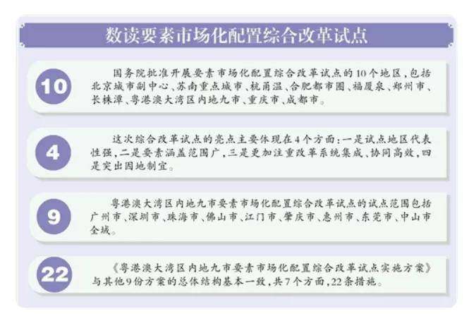 国务院近日发布关于全国部分地区要素市场化配置综合改革试点实施方案的批复,同意自即日起2年内,在北京城市副中心、苏南重点城市、杭甬温、合肥都市圈、福厦泉、郑州市、长株潭、粤港澳大湾区内地九市、重庆市、成都市等10个区域开展要素市场化配置综合改革试点,为全国统一大市场建设提供差异化探索经验。粤港澳大湾区内地九市即指广州市、深圳市、珠海市、佛山市、江门市、肇庆市、惠州市、东莞市和中山市。