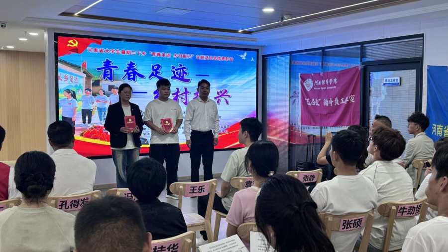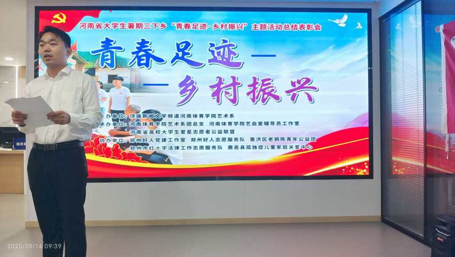 9月14日上午,由顶端新闻文学频道、河南体育学院艺术系团总支、河南体育学院学工部“一站式”学生社区、河南省高校大学生爱星志愿者公益联盟联合主办的以“青春足迹·乡村振兴”为主题的大学生暑期三下乡社会实践活动总结表彰会在河南体育学院圆满举办,活动旨在总结暑期三下乡活动成果,表彰先进典型,进一步激发青年学子投身乡村振兴的热情。