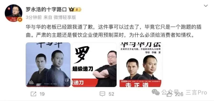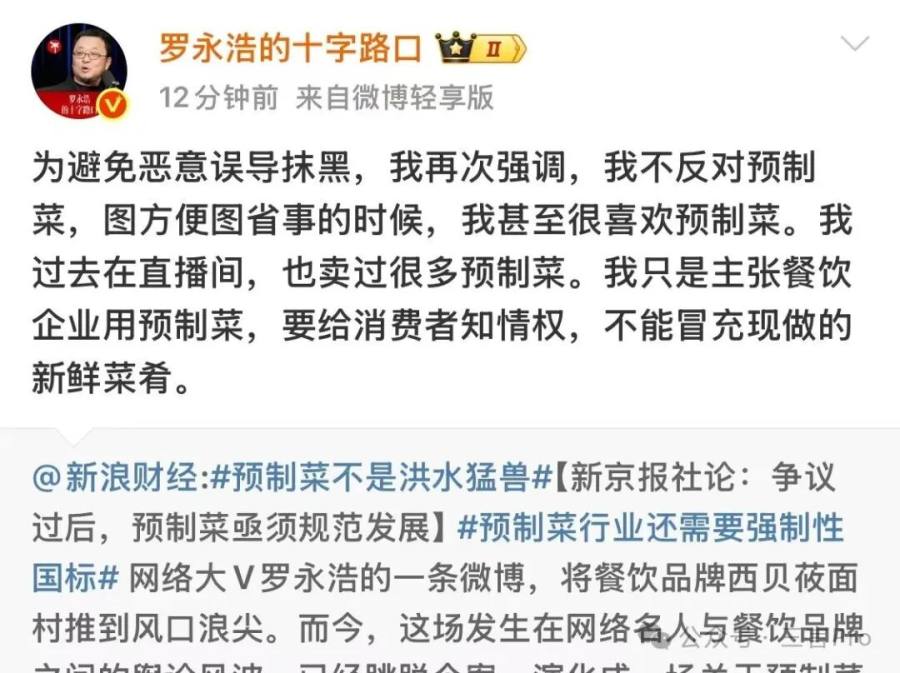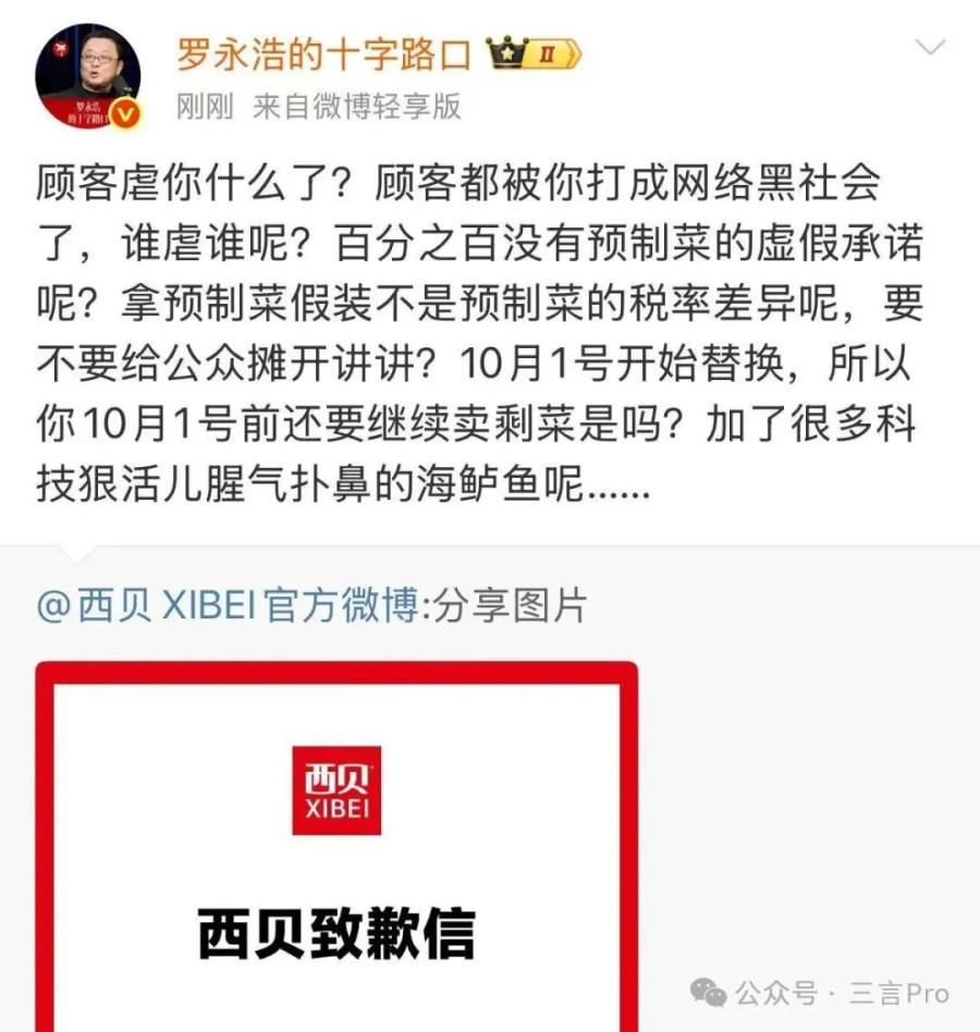 9月13日,罗永浩转发华杉微博并质疑其动机。并称感觉贾老板和贾老板的朋友们想把西贝搞死。