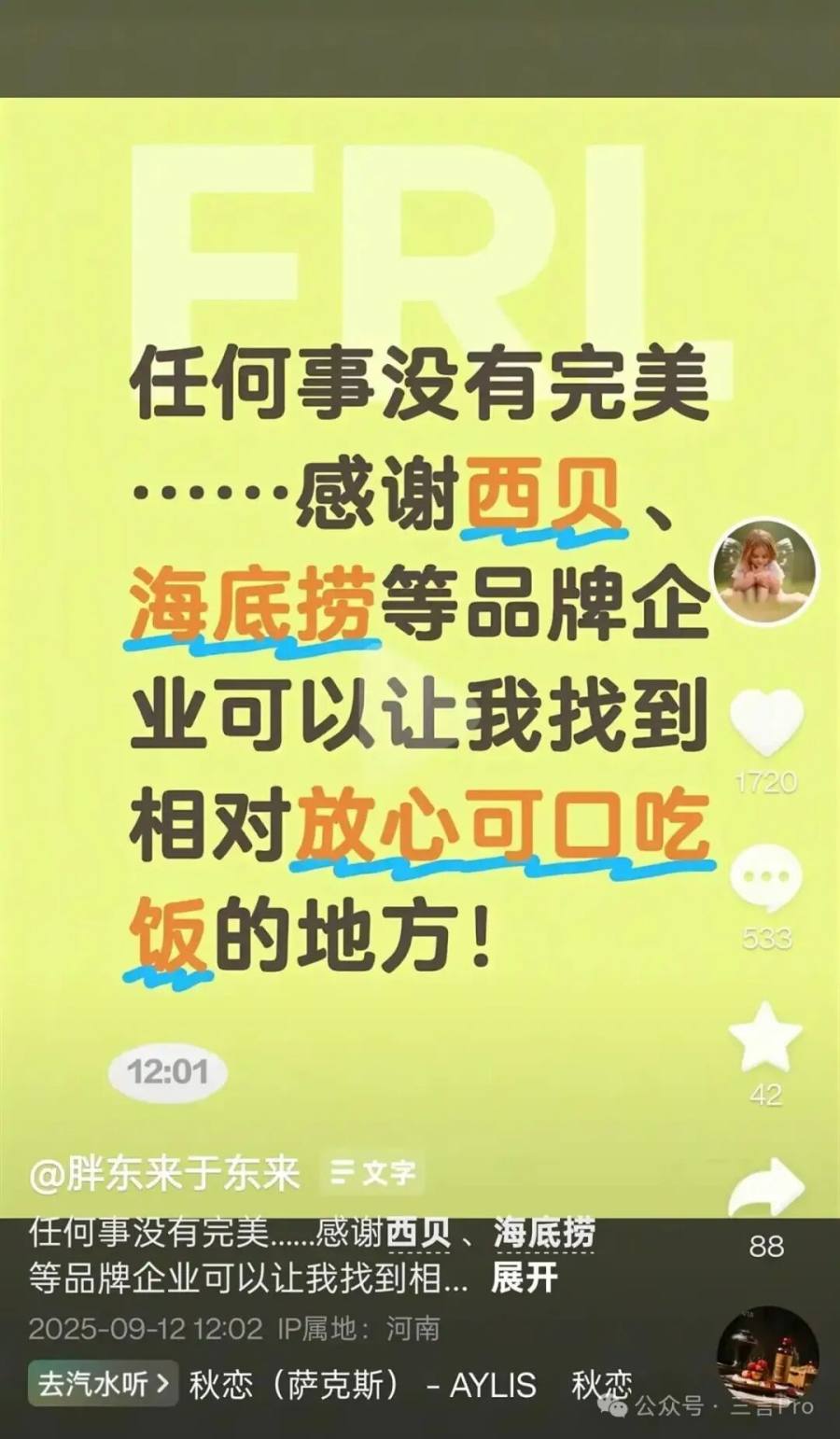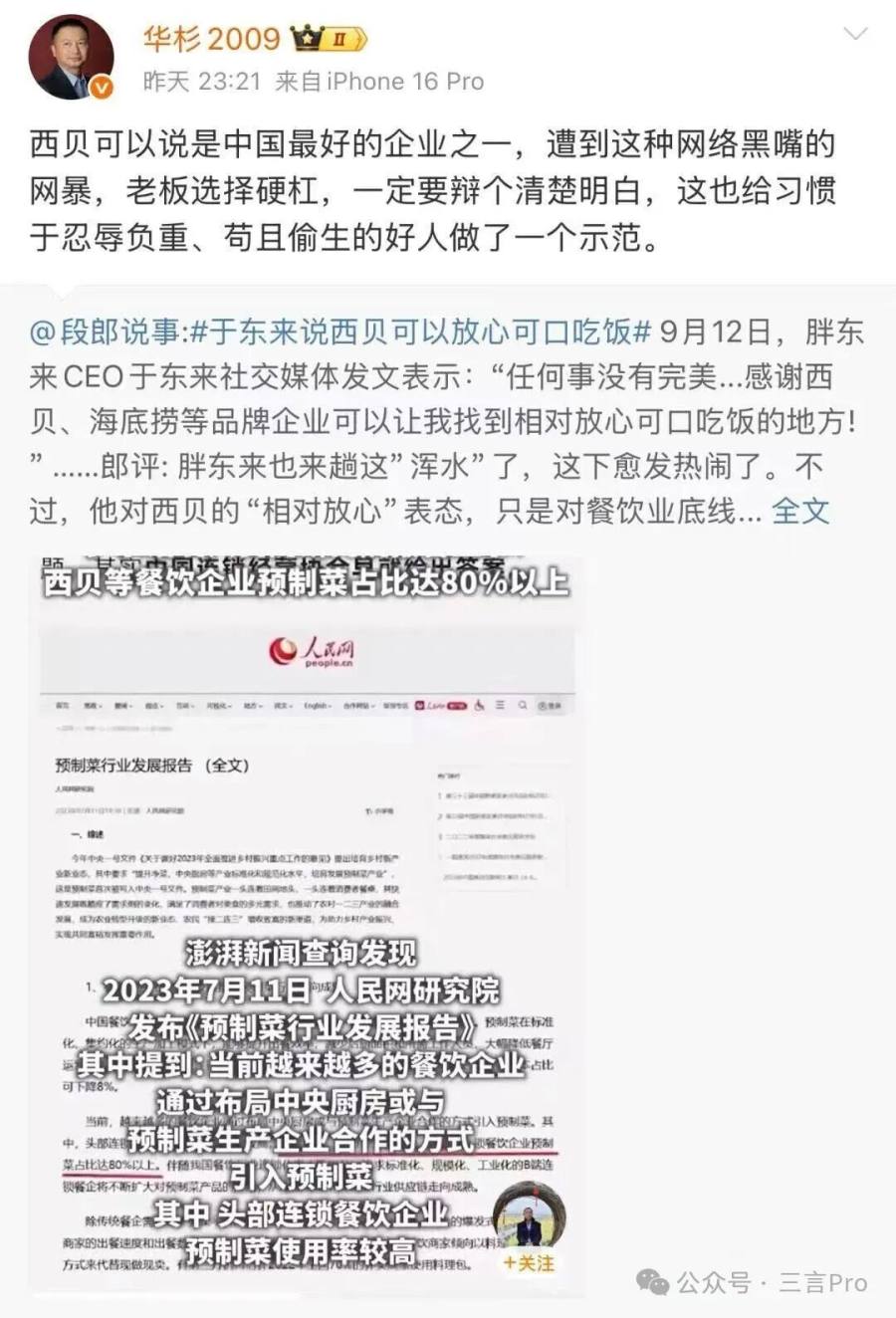 9月12日,于东来发文力挺西贝:“任何事没有完美...感谢西贝、海底捞等品牌企业可以让我找到相对放心可口吃饭的地方! ”