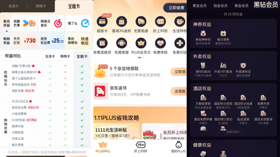 如果在社交平台上搜索,不难发现,诸多网友也陷入选择恐惧:“京东PLUS划算还是88VIP?”“88VIP到底选生活卡还是全能卡?”“外卖神券力度这么大,还有必要为了饿了么的会员去买88VIP吗?”……