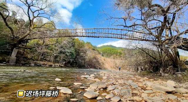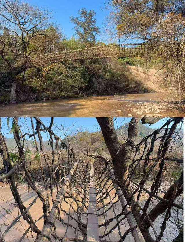 藤桥是没有桥墩的桥,荷载全都拉在两头大树上,用直径20~30厘米不等的野葡萄藤拧成两根长绳,平行系于沘江两岸的大树上,在藤绳上吊一张用藤条编织的大网,在网两侧穿圆木作扶手,在网底铺木方作桥面,从远处看,整座藤桥像一张悬挂在江面上的鱼网,网格大小不一,穿梭人影太匆匆,古朴原始。这,就是最早桥梁,历史学家推算至少也是2000多年了,现在仍有5座在沘江上,仍然发挥作用,保存尚好的天工巧夺。
