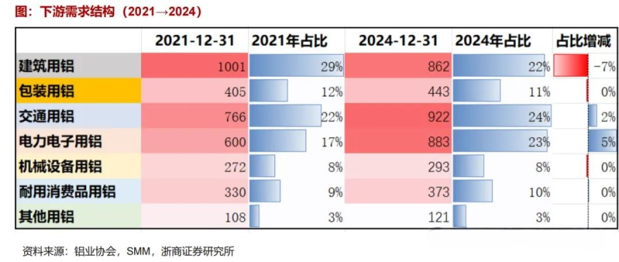 而看需求,市场存在两个预期。其一是总量上机构预计国内近三年电解铝消费增速预计分别达1.6%、1.4%、2.0%,需求拥有超越供给的增长弹性,意味着产业链龙头公司有定价空间。其二是需求结构的演变上,尽管近三年建筑用铝需求占比下降了7%,但交通、电力电子等行业的需求高增,光伏、新能源汽车、风电等赛道采用更多铝合金产品,创造了增量的来源。