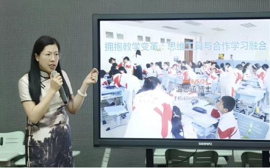 这样的 “手把手” 指导,是温思涵推进教改的日常。在成都教科院的年度培训会上,面对 1000 余名教师和 80 人的大班额学生,她现场组织小组合作,开展诗歌赏析与创作课,让在场教师直观看到 “大班额也能搞合作学习”;在锦州新世纪博雅实验学校,她手把手教教师绘制数学思维导图,提出 “一级脉络绘重点、二级脉络绘难点” 的实用方法,解决教师 “不知如何将工具融入学科” 的困惑;在北京海淀区双榆树第一小学,她带领教师用 “回顾目标 — 评估结果 — 分析原因 — 总结规律” 的复盘模型反思教学设计,帮助教师精准定位课堂问题、迭代教学策略。