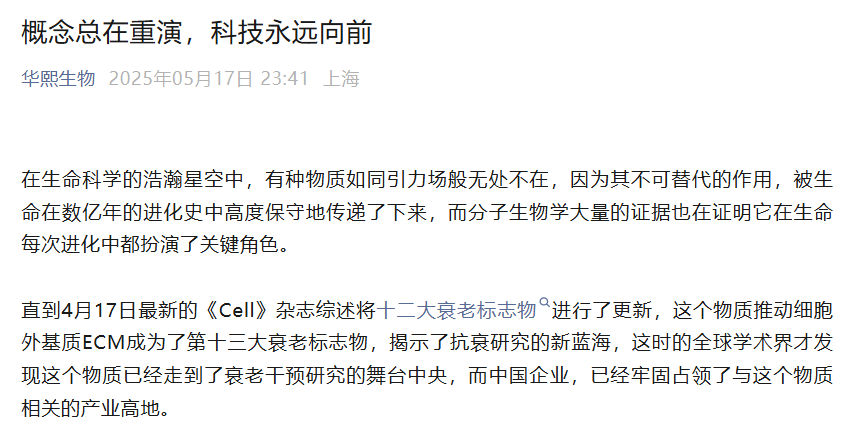 5月17日晚,华熙生物官方微信公众号发文《概念总在重演,科技永远向前》,炮轰多家券商为“港股重组胶原蛋白第一股”巨子生物站台。