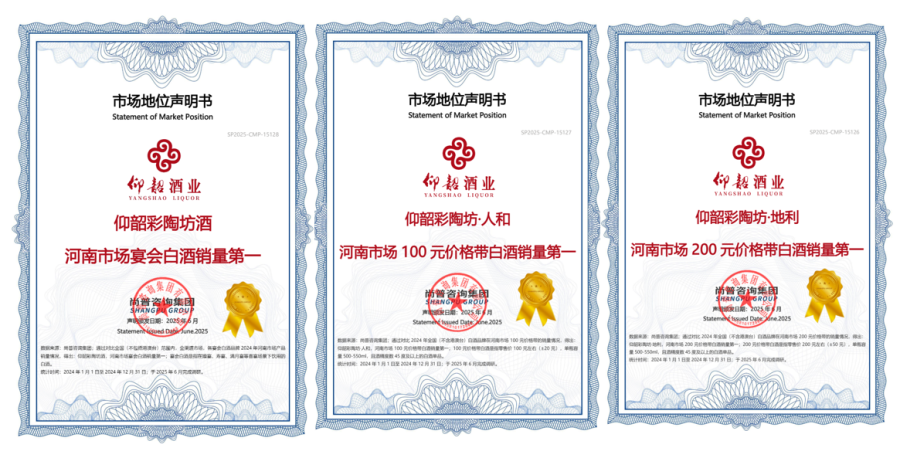 近日,经专业机构尚普咨询认证,仰韶彩陶坊酒摘得“河南市场宴会白酒销量第一”,其核心单品仰韶彩陶坊·人和斩获“河南市场100元价格带销量第一”,仰韶彩陶坊·地利夺得“河南市场200元价格带销量第一”。
