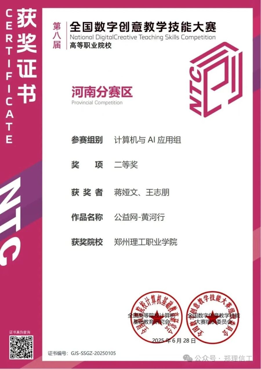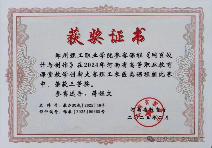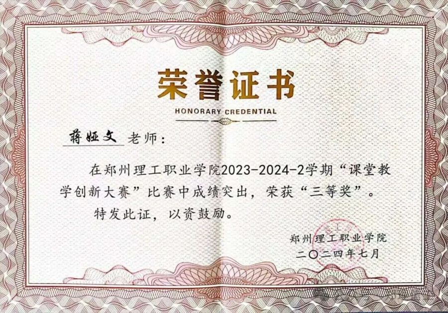 荣誉,是奋斗的最好见证。蒋娅文先后荣获校级“课堂教学创新大赛”三等奖、2024年河南省高等职业教育课堂教学创新大赛理工农医类课程组三等奖,以及第八届全国数字创意教学技能大赛河南赛区二等奖。这一连串的奖项,不仅是对她专业能力的认可,更是对她执着于教学改革、专注课堂质量的充分肯定。尤其在她获得的省级和国家级教学竞赛奖项中,充分体现出其课程设计的前沿性、教学实施的有效性,以及将数字技术深度融入专业教学的创新能力。